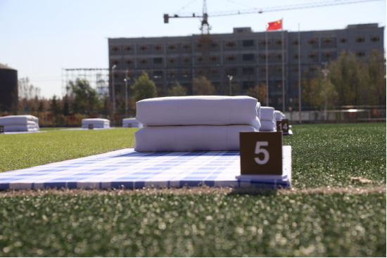为使比赛规范、公平、公正、顺利的进行,比赛前半小时对45名选手出场顺序随机排序。随着主持人一声令下,45名选手迅速附身蹲下,从容不迫的开始整理手中的军被,铺平、压实、翻折、抠角、捏线,选手们动作干净利落,训练有素。他们认真调整被子角度,不放过一丝褶皱,就是要将自己最好的训练水平呈现出来。比赛时间到,参赛选手撤离场地,一床床整齐洁白、棱角分明军被呈现在体育场上。