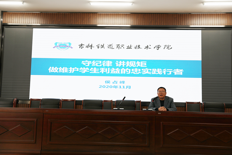 随后,侯占峰作了题为《守纪律讲规矩做维护学生利益的忠实践行者》的报告。他从强化思想武装,提高政治站位、坚持以学生为本,切实维护学生利益、勇于担当责任,切实履职尽责、树立自身良好形象,营造和谐师生关系、近年来违反师德师风的典型案例、增强自律意识,永葆清正廉洁等七个方面展开,报告内容紧贴实际、深入浅出、发人深省。与会人员认真聆听,深受教育与启发。