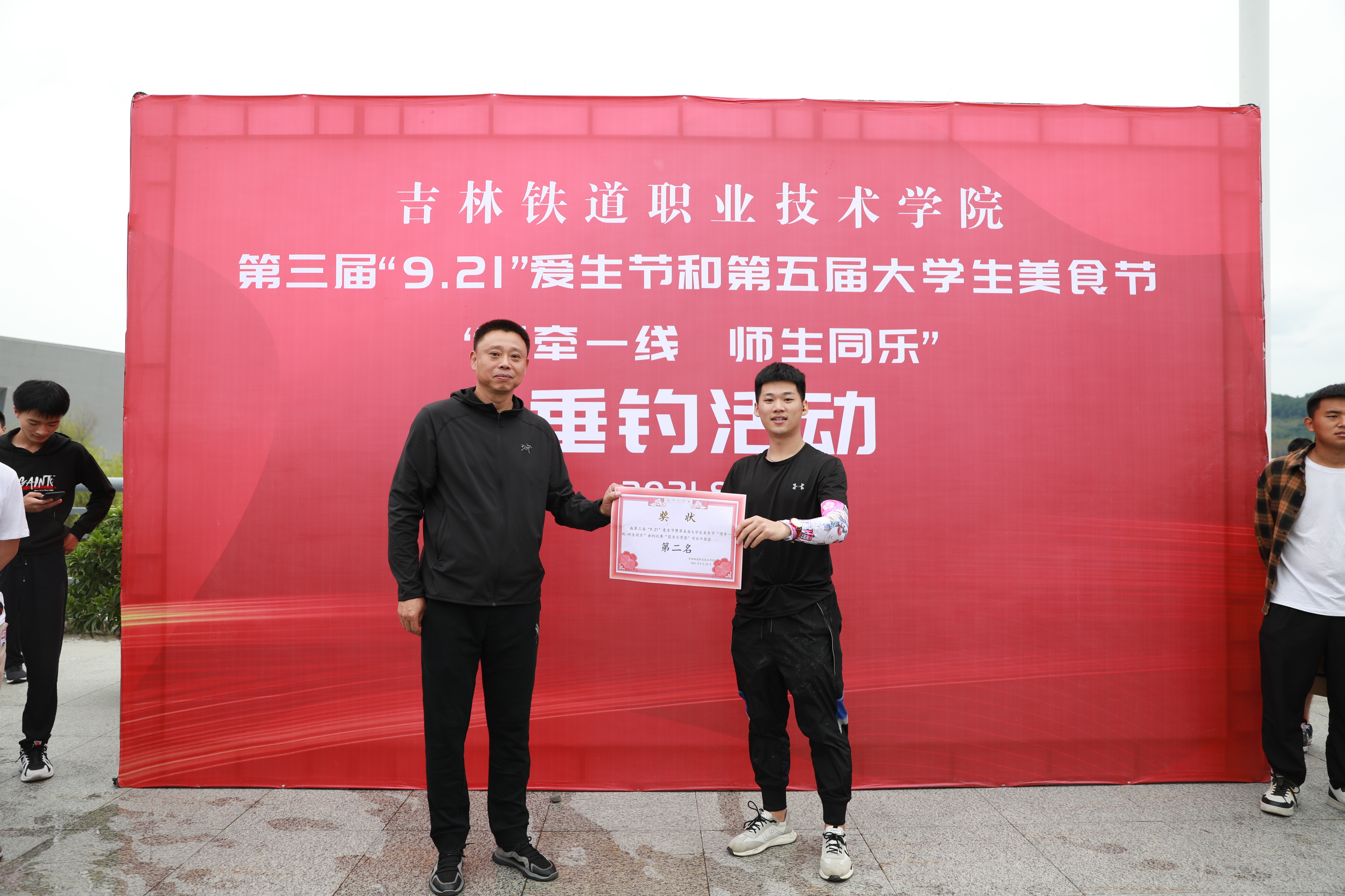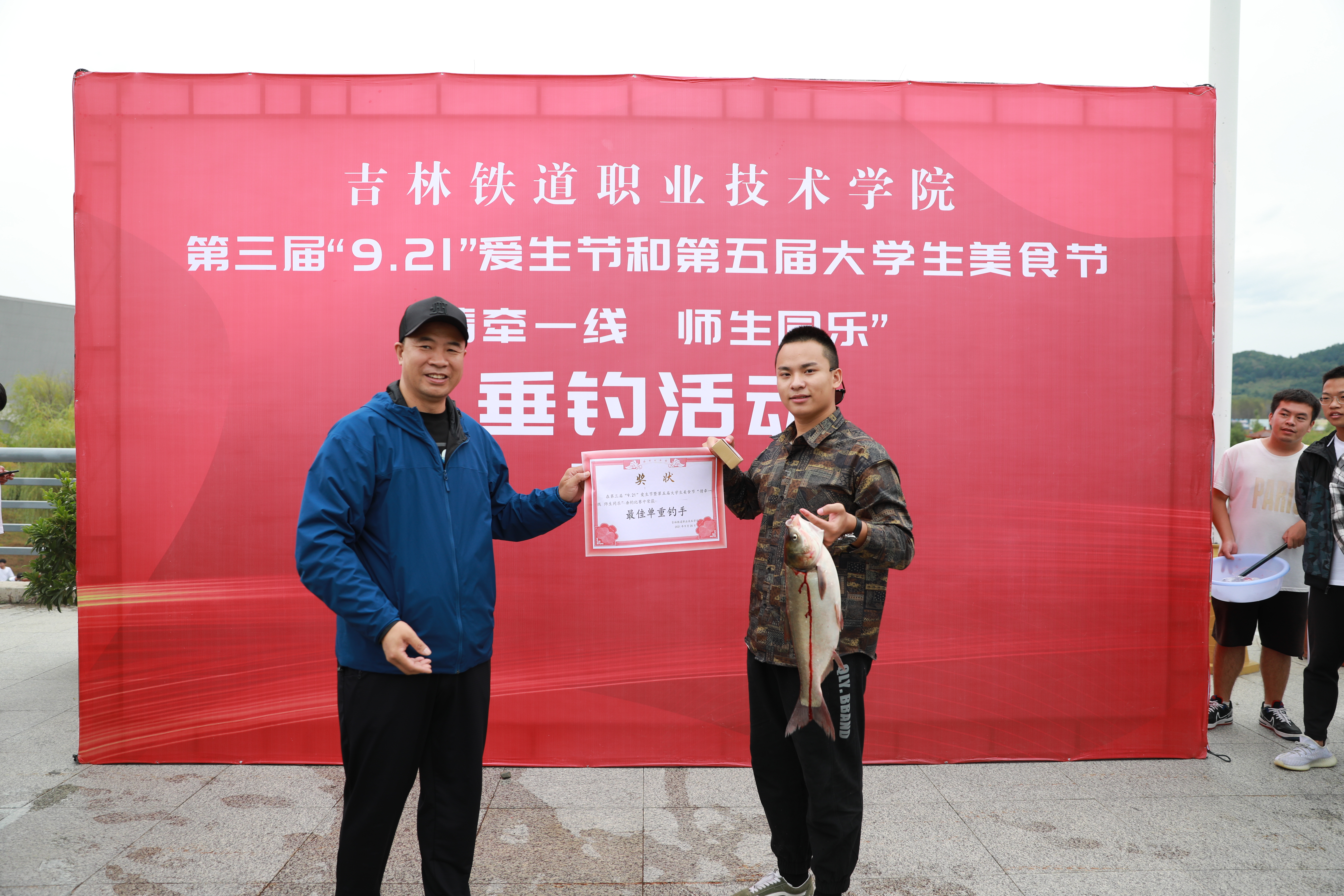 “9·21”爱生节前日,学校还举办了“情牵一线 师生同乐”师生垂钓比赛活动,党委副书记、校长曹炳志和副校长李欣来到现场参与活动并为获奖老师和学生颁发奖品和证书。比赛所获鱼将被制作成鱼宴,在爱生节当天免费供学生品尝。