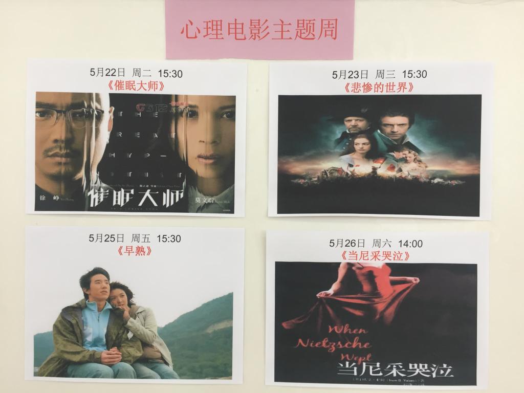 此次活动播放的电影是《催眠大师》、《悲惨的世界》、《早熟》、《当尼采哭泣》。电影情节跌宕起伏,感染性强,表现了主人公面对困境、面对恐惧、面对内心的脆弱点时我们应该如何去应对,如何去调适自己的心理状态。